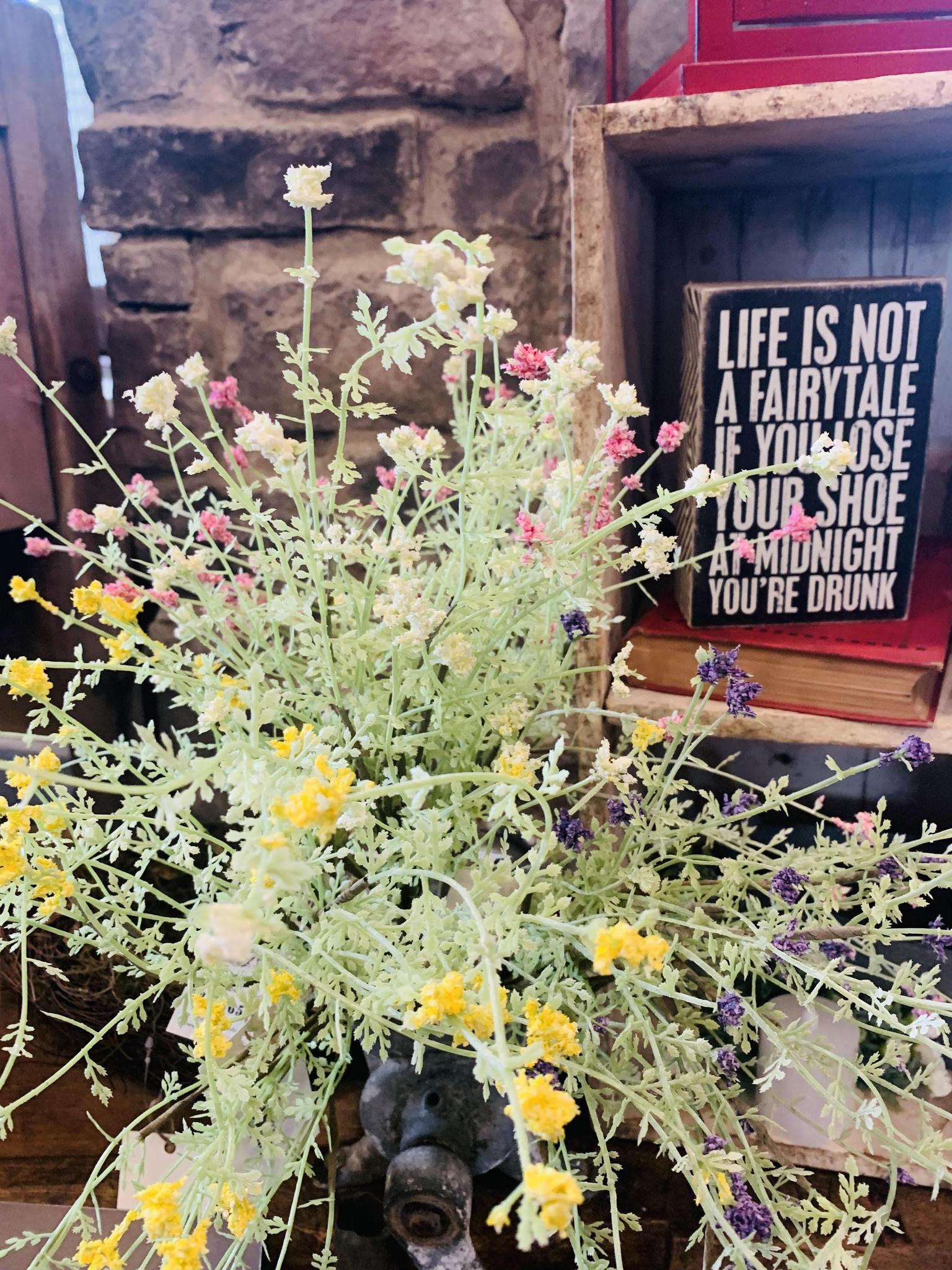 These beautiful floral picks come in your choice of color. Made of a soft, light green color greenery and accented with Pink, White, Yellow or Purple flowers. Each color sold separately. All props with flowers sold separately.