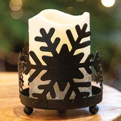 Black Metal Snowflake Candle Holder is a cutout candleholder crafted from metal with festive wintry design. The candle holder features a black snowflake design on a tray base with three ball feet for stable freestanding display. It holds standard pillars or other candles under 3.75" in diameter. Candle sold separately. Measures 4.5" x 3.75" in diameter.