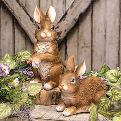 The Brown Resin Bunnies are an assortment of two decorative bunny figurines made of intricately carved resin material, complete with realistic brown fur and lively detailing for an authentic look. One bunny is sitting and one is lying down, each with flat bases for a freestanding display. Place these bunnies on a shelf, table, porch, or garden for a charming addition to the home during spring. Standing bunny measures 9” high by 5” wide by 4” deep. Laying bunny measures 5.5” high by 6.5” wide by 4” deep. Each sold separately.