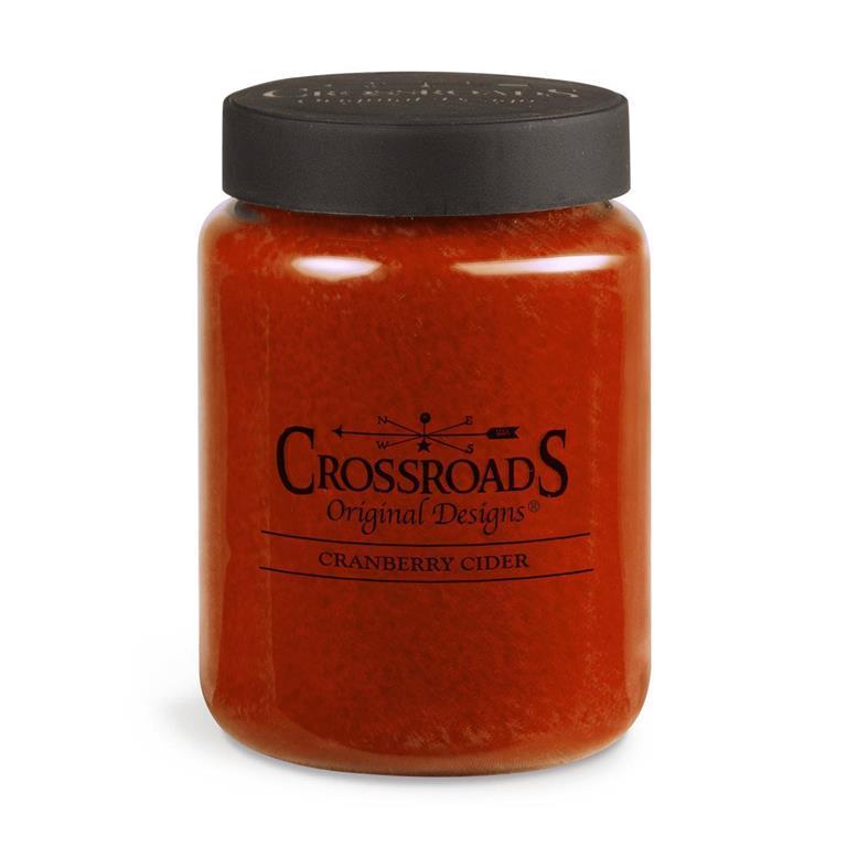 Tangy cranberry, apple and cinnamon with a touch of citrus peel. 26 oz jar candle with 2 wicks for even burning. Burns approximately 120-140 hours. Made in USA by Crossroads Candle Company.