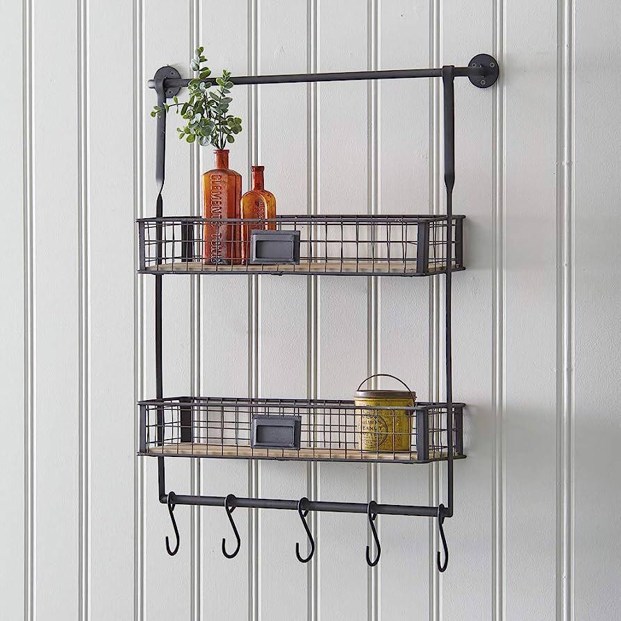 This Double Shelf Organizer With Five Hooks will make an ideal addition to any room in your home, from the bathroom to the kitchen. Crafted of sturdy metal and complete with wooden shelves, it's a perfect choice for efficient storage. Measuring approximately 6"D x 23"W x 26.75"H