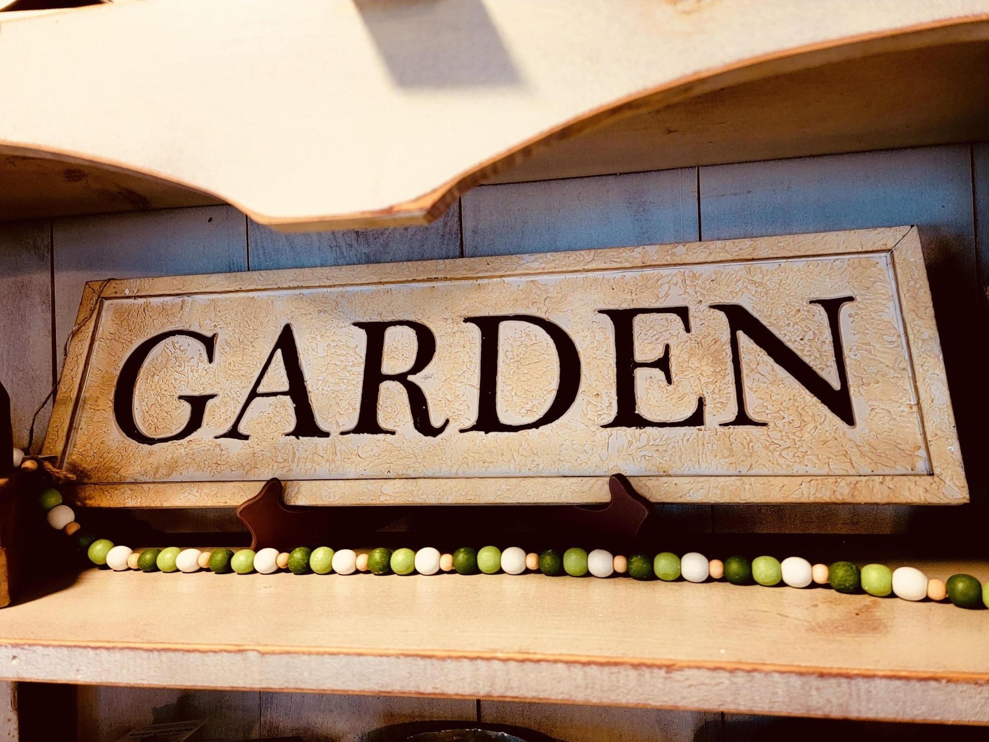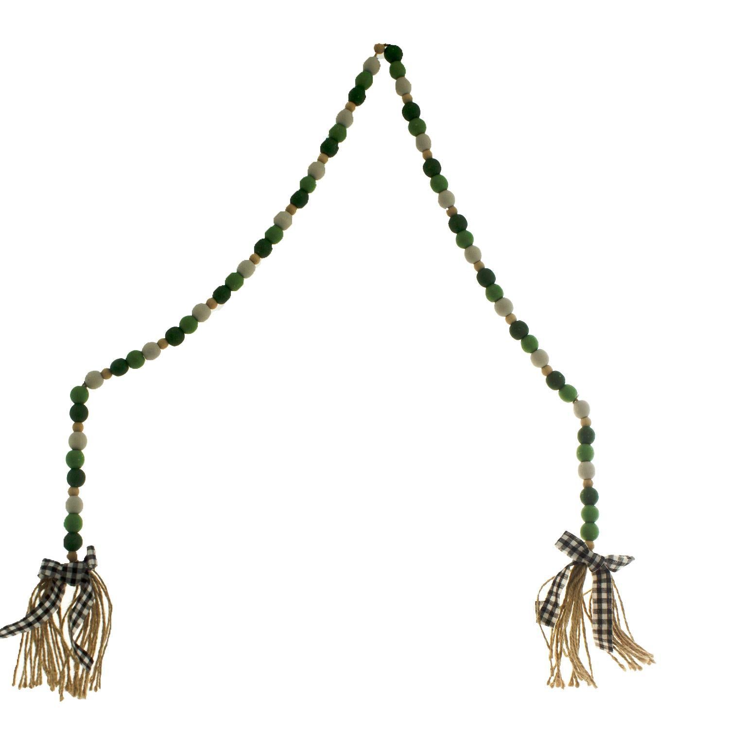 This lovely garland will add a bit of texture to anywhere you chose to incoprate it in your decor. Made of green and cream beads with tassels on each end. Garden sign sold separately. Measures approximately 48" long.