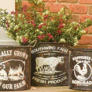 This "Large Black Emobossed Farm Pot" will add just the right amount of nuetral color to your Farmhouse decor. Made of metal, painted black with raised lettering and design that is painted white. It has a Cow on the front and the words "Southwind Farm Since 1977 Butter*Cream*Milk*Cheese Fresh Produce" The Large Embossed Farm Pot has two metal handle and is distressed over all. Small and Medium Black Embossed Farm Pots and florals sold separately. Measures approximately 13" T x 18" W x 11" D
