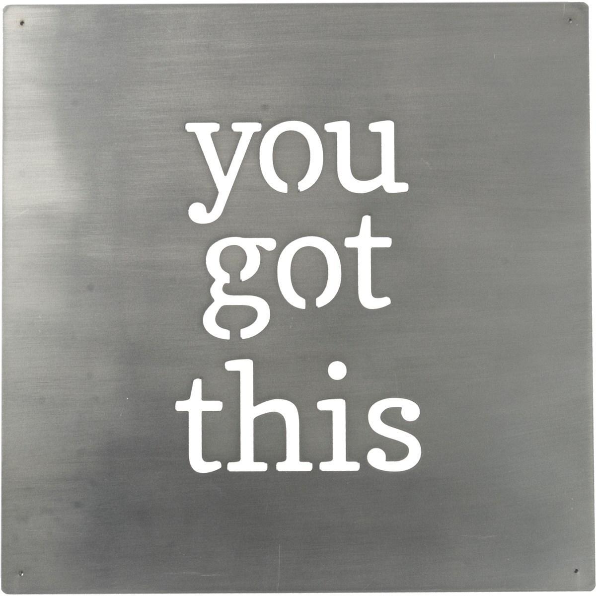 Inspiring "You Got This" precision cut sentiment in a brushed metal plate. When hung via the included nails & spacers and illuminated, a soft shadow will be projected behind metal word art, creating charming ambience. Approximae size 12" x 12".
