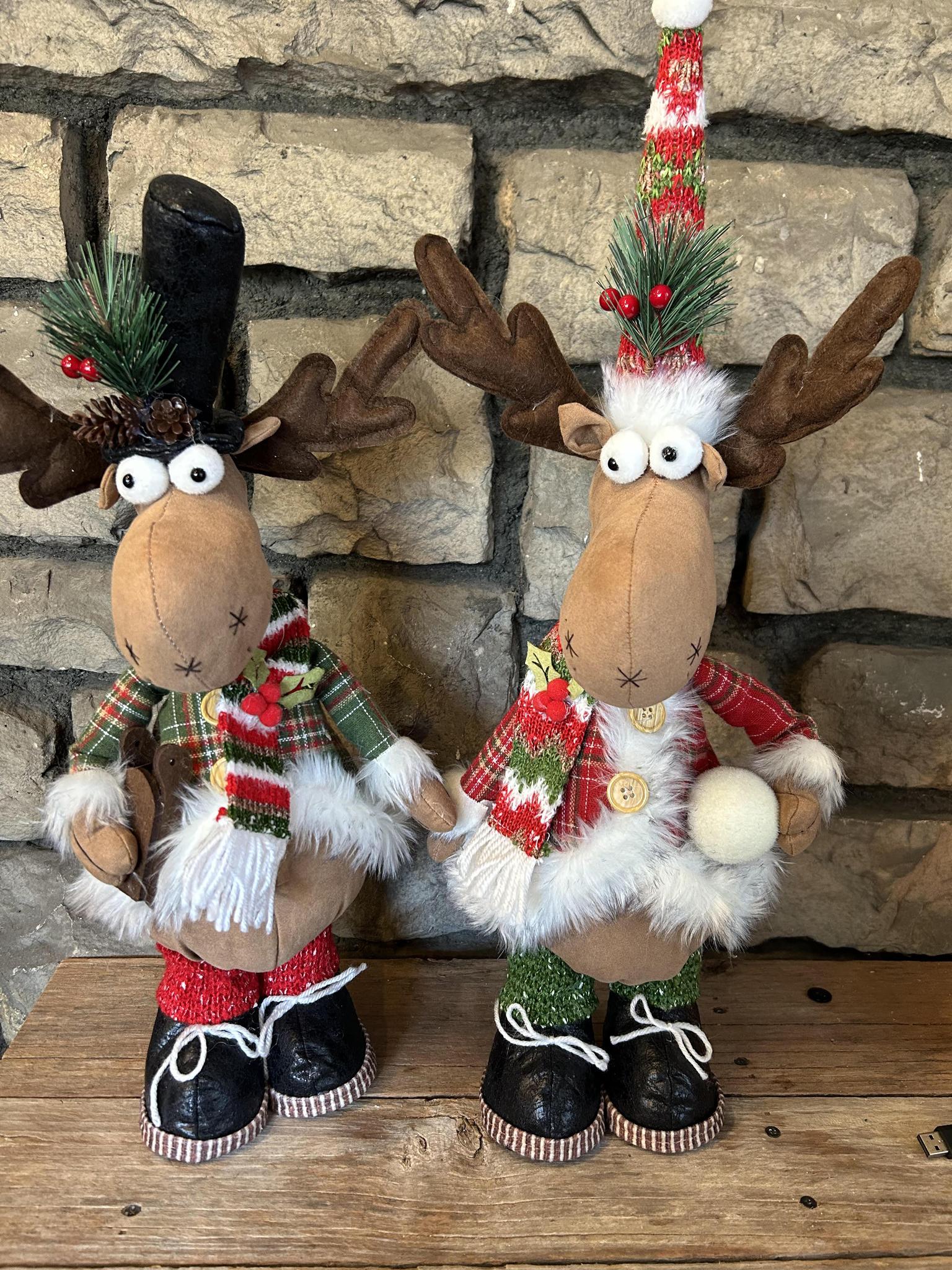 This adorable North Pole Millie standing Moose would be a great addition to your moose collection and Holiday decor. She is wearing a red and green plaid shirt trimmed in white fur, with wooden buttons. Her socks are green knit with white dots. Her scarf is red and green with white fringe and a holly leaf. She is holding a snowball with left her arm. On top of her head she is wearing a red and green stocking hat with white fur, trimmed with greenery and red berries. She has large brown antlers and white buggy eyes. She is approximately 9.5"W x 21"H x 6"D. Mosey the Standing Moose and all other decor sold separately.