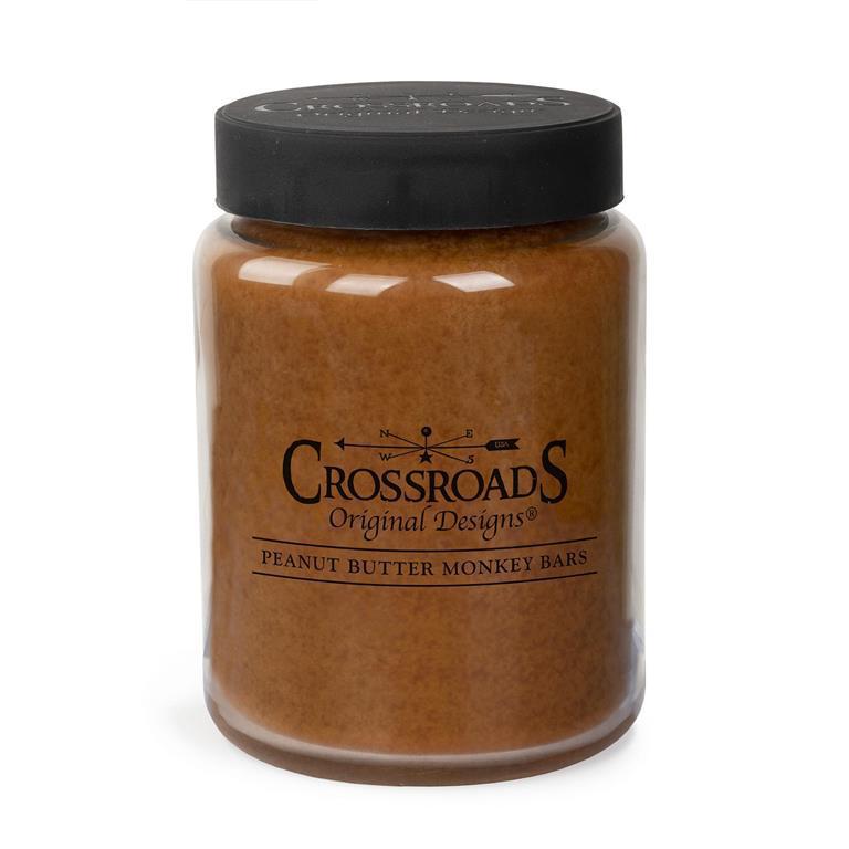 The warm inviting scents of banana cream, peanut butter, white chocolate and vanilla. 26 oz jar candle with two wicks for even burning. Burns approximately 120-140 hours. Made in the USA by Crossroads Candle Company.