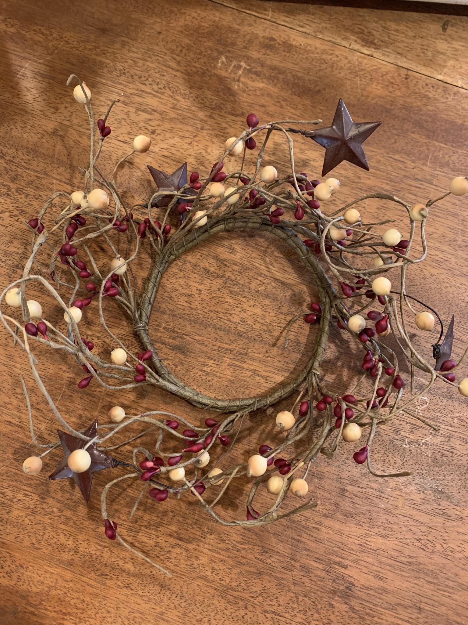 This Pip And Star Wreath will add a nice primitive touch to your candle riser. Made of red pips, cream berries and rusty metal stars. Measures approximately 4" inside and 10" outside.