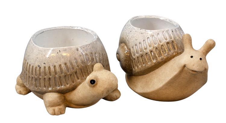 Add one or both of these adorable Snail and Turtle Planters to your home. These make great vessels for your house plants. Made of porcelain and glazed for a natural look. Each sold separately. Measures approximately 7.5" L x 5.5" T x 3.3" W