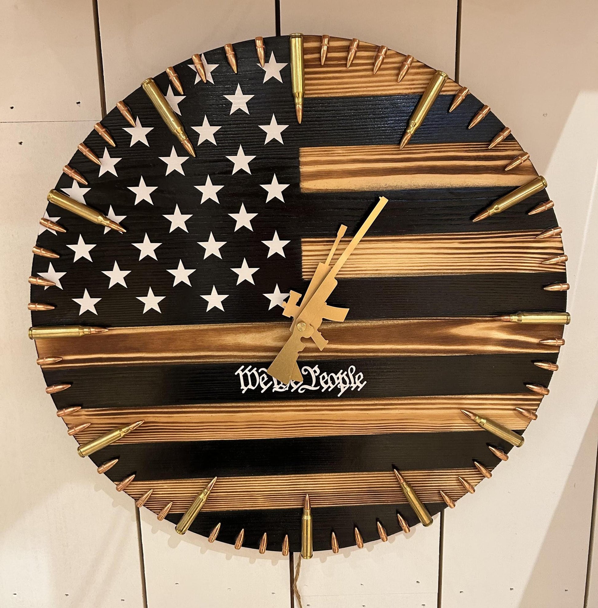 Show that you are proud to be an American with this We The People Wall Clock. Made of wood, embellished to represent the American Flag with the stars and stripes, bullet casings and firearm hands. Made in America. Measures approximately 16"R x 1"D