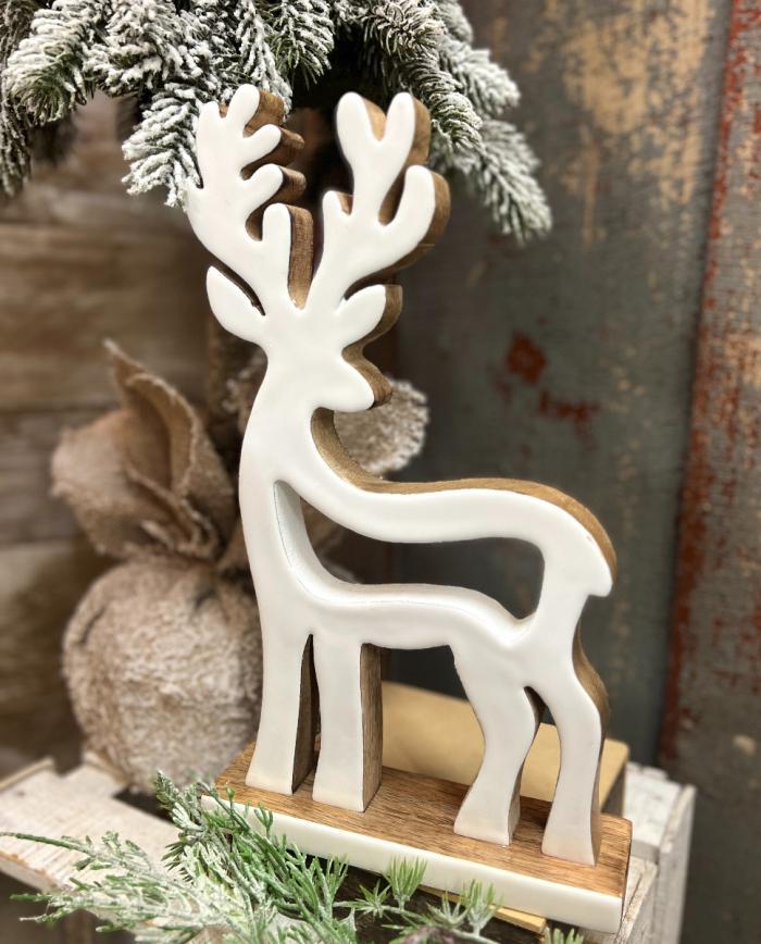 This stunning White Enamel Deer will look stunning in your home this winter season. Made of wood and embellished with white enamel. Measures approximately 12"T x 7"W x 2"D