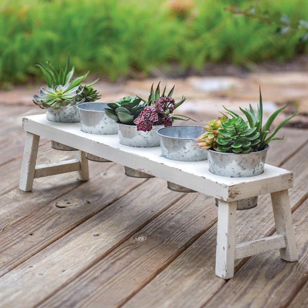 This planter is made of wood, painted white and distressed. It houses 5 metal buckets, each bucket is 5¼'' dia x 5''H. The wood planter measures approximately 31½''W x 6¾''D x 10''H. Plants sold separately.