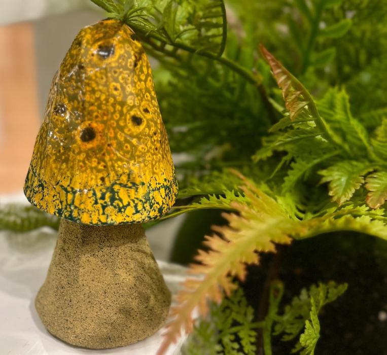 This Yellow Morel Mushroom would be a great addition to your fairy garden. Made of ceramic, painted in yellow with green, brown and orange for a nice patina. Greenery sold separately. Measures approximately 4.5"T x 2.5"D